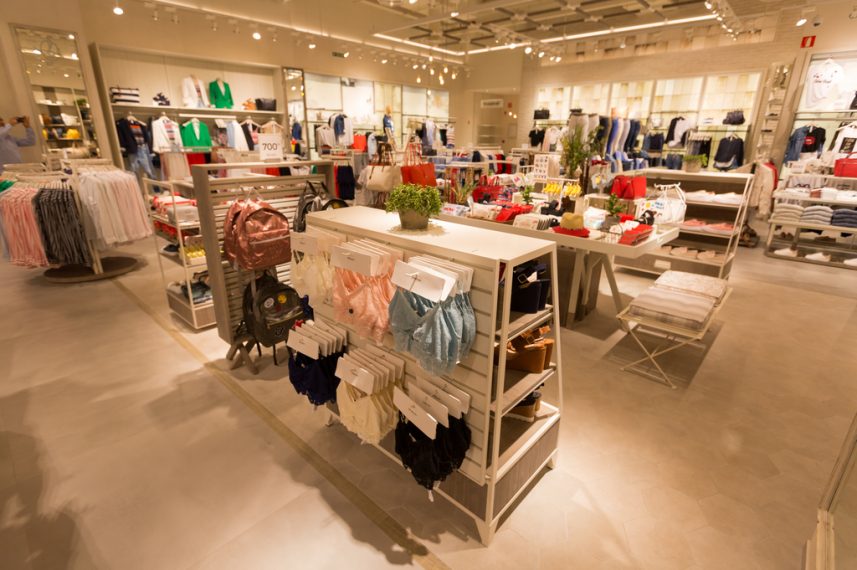 Prendas de vestir e interiores, calzado y accesorios de diseño moderno en tiendas de moda joven femenina y masculina.